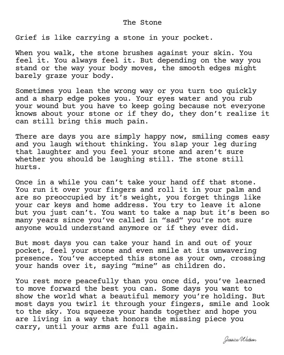 Grief doesn’t disappear—it changes shape. Over time, what once felt unbearably heavy can become something you carry with grace, even love. The weight remains, but so does the reminder of how deeply you’ve lived, loved, and learned to keep moving forward with a fuller heart. We found this poem so accurate and so beautiful.