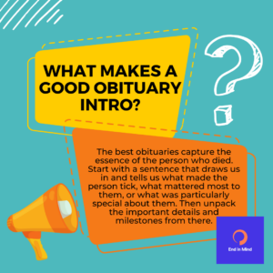 So, what makes a good intro? You want to capture the essence of the person in a sentence or two that draws people in and tells readers what made the person tick, what mattered most to them, or what was particularly special about them. Then, from there, you can unpack the rest of their life and relay the important dates and details.
